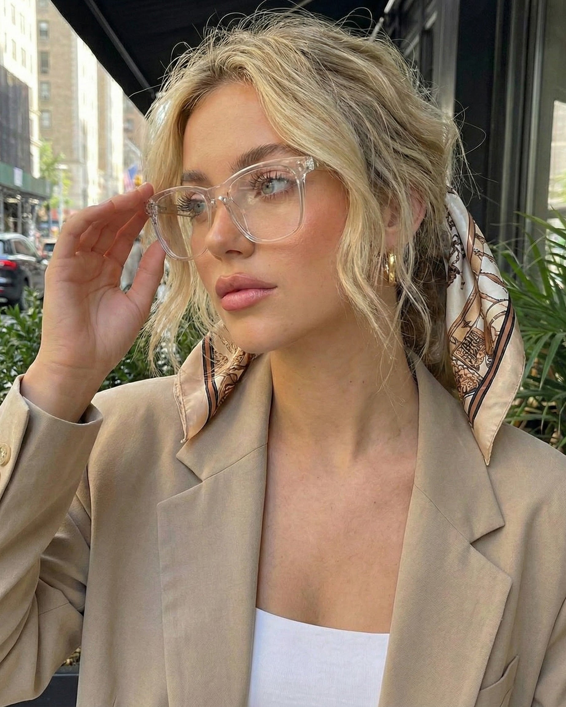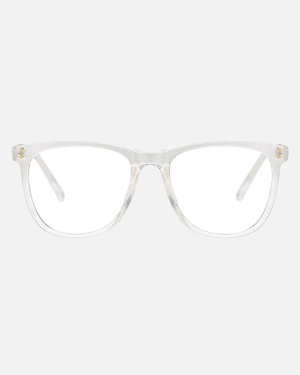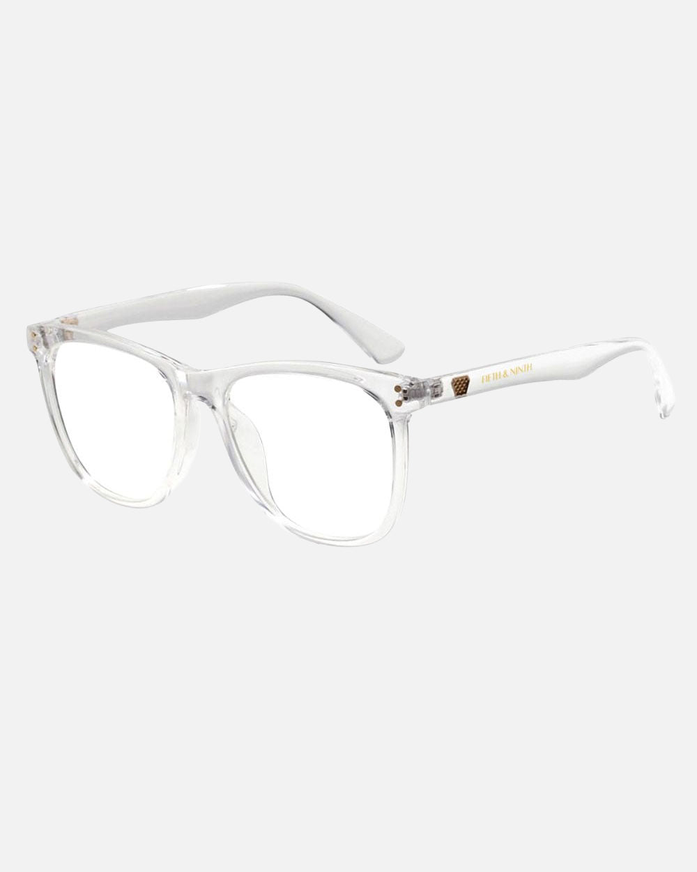 Mesa Blue Light Blocking Glasses feature a soft square frame in crystal-clear acetate, accented with gold details and subtle temple texture. The gently rounded silhouette flatters a variety of face shapes and adds a clean, modern touch to your everyday look—whether you're working from home or out and about.